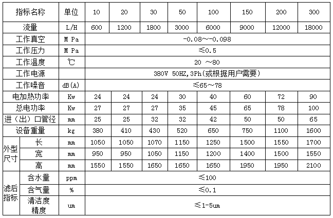 L系列液壓油專(zhuān)用小型真空濾油機(jī)參數(shù):